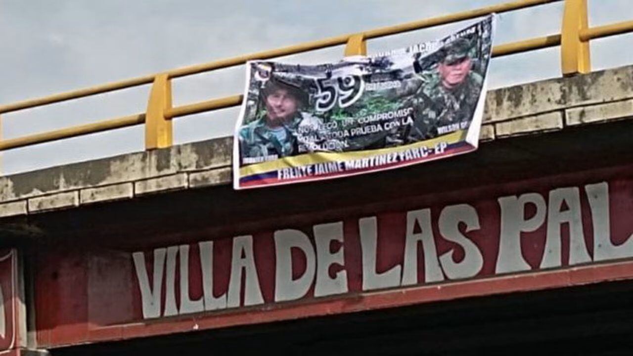 Las dos pancartas tienen el mismo mensaje: “Nos llegó un compromiso vital, a toda prueba con la revolución”, se lee en el cartel, que está acompañado por dos fotografías de cabecillas de las disidencias de las Farc.