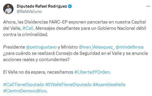 “Ahora, las disidencias Farc-EP exponen pancartas en nuestra capital del Valle, Cali. Mensajes desafiantes para un Gobierno nacional débil contra la criminalidad. Presidente @petrogustavo y ministro @Ivan_Velasquez_ @mindefensa, ¿para cuándo se realizará Consejo de Seguridad en el Valle y se anuncie acciones reales y contundentes? El Valle no da espera, necesitamos #LibertadYOrden”, cuestionó en su cuenta de Twitter el diputado Rafael Rodríguez, tras la aparición de las pancartas.