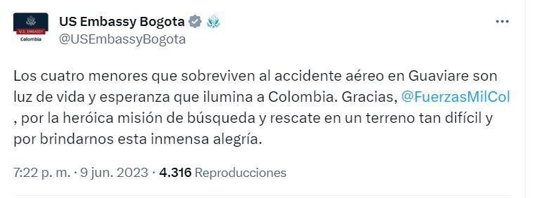 La Embajada de los Estados Unidos en Colombia dio sus felicitaciones a las Fuerzas Militares por su trabajo en la selva y lo calificó como algo heroico: “Los cuatro menores que sobreviven al accidente aéreo en Guaviare son luz de vida y esperanza que ilumina a Colombia. Gracias Ejército por la heroica misión de búsqueda y rescate en un terreno tan difícil y por brindarnos esta inmensa alegría”.
