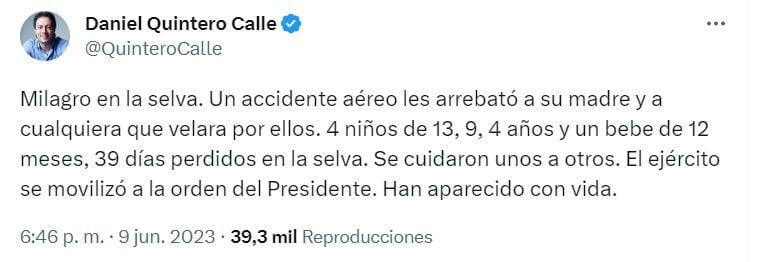 “Milagro en la selva. Un accidente aéreo les arrebató a su madre y a cualquiera que velara por ellos. 4 niños de 13, 9, 4 años y un bebe de 12 meses, 39 días perdidos en la selva. Se cuidaron unos a otros. El ejército se movilizó a la orden del Presidente. Han aparecido con vida”, escribió el alcalde de Medellín, Daniel Quintero Calle.