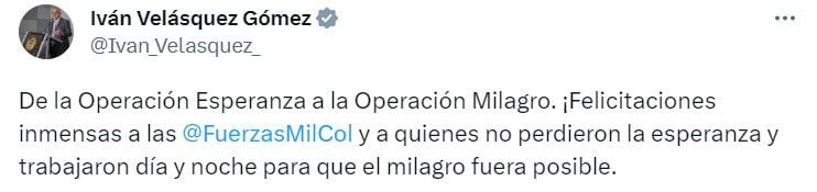 Iván Velásquez, ministro de Defensa, felicitó a las Fuerzas Militares “y a quienes no perdieron la esperanza y trabajaron día y noche para que el milagro fuera posible”, junto con unas imágenes de los niños acompañados por los uniformados en medio de la selva.