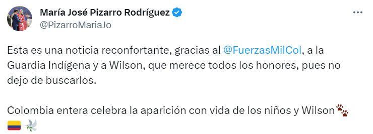 Otra persona que envió su mensaje fue la senadora María José Pizarro, senadora del Pacto Histórico: “Esta es una noticia reconfortante, gracias a las Fuerzas Militares, a la Guardia Indígena y a Wilson, que merece todos los honores, pues no dejo de buscarlos. Colombia entera celebra la aparición con vida de los niños y Wilson”.