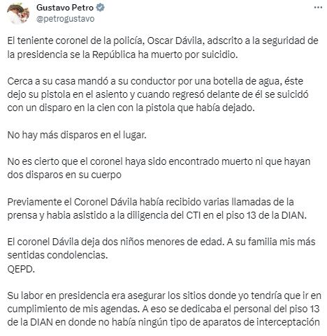 A través de su cuenta de Twitter, el mandatario nacional explicó que el fallecido oficial hacía parte del cuerpo de seguridad de la presidencia de la República. Así mismo, dio detalles de la información que logró obtener, señalando que, presuntamente, el coronel Dávila le dio la orden a uno de sus conductores de ir por una botella de agua; sin embargo, un arma habría quedado expuesta y con esta procedió a dispararse.
