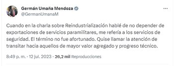 Ante los cuestionamientos, el ministro de Comercio usó la misma red social para salir a aclarar la controversial afirmación. De acuerdo con el alto funcionario, su declaración hacía referencia a los “servicios de seguridad”.