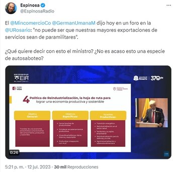 “Aprovecho la atención generada por este tema para que vean el video completo y conozcan las nuevas políticas de reindustrialización, turismo y comercio exterior que lanzamos desde @MincomercioCo”, agregó el jefe de la cartera de Comercio.