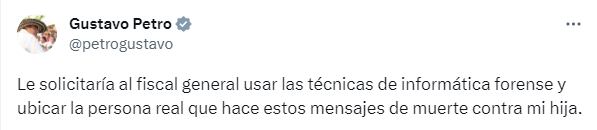 Ante esto, el presidente Petro elevó una solicitud a la Fiscalía General de la Nación para que inicie un proceso de informática forense con el fin de ubicar a la persona que profirió las amenazas en contra de su hija.