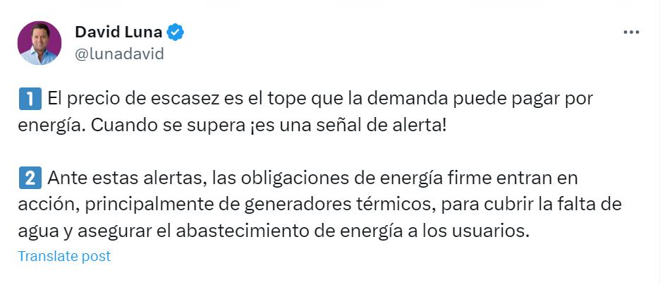 A través de sus redes sociales, el congresista expuso varios puntos al respecto: “El precio de la energía en bolsa se está acercando al precio de escasez. Esto es una señal de alarma para los hogares, pues los recibos de la luz verán incrementos debido a esto”, escribió Luna en su cuenta de X (antes Twitter).