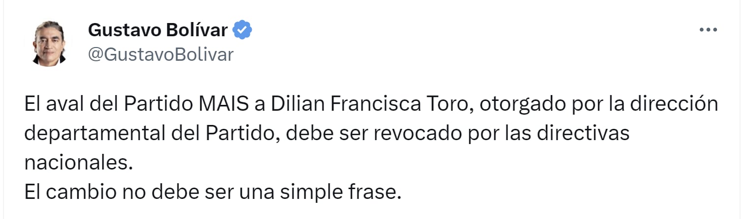 Gustavo Bolívar, candidato del Pacto Histórico con el coaval del Mais, también rechazó que ese partido, que en otras oportunidades le dio el aval para el Congreso, apoye a la exdirectora de La U. “El aval del Partido Mais a Dilian Francisca Toro, otorgado por la dirección departamental del Partido, debe ser revocado por las directivas nacionales. El cambio no debe ser una simple frase”, escribió en su cuenta de Twitter.