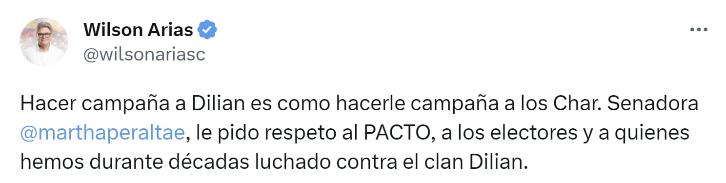 “Hacer campaña a Dilian es como hacerle campaña a los Char. Senadora @marthaperaltae, le pido respeto al PACTO, a los electores y a quienes hemos durante décadas luchado contra el clan Dilian”, escribió el senador Arias en su cuenta de X, antes Twitter.