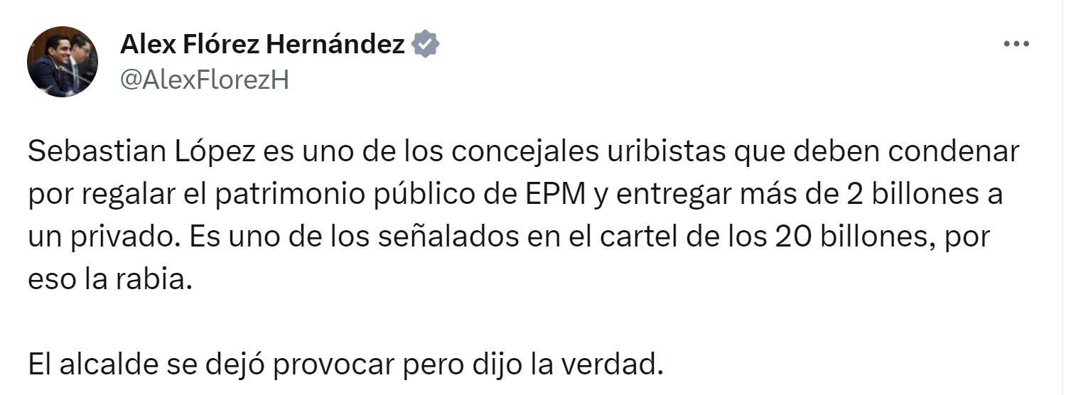 El senador Alex Flórez, cercano a Quintero, también se pronunció. “Sebastián López es uno de los concejales uribistas que deben condenar por regalar el patrimonio público de EPM y entregar más de 2 billones a un privado. Es uno de los señalados en el cartel de los 20 billones, por eso la rabia. El alcalde se dejó provocar pero dijo la verdad”, escribió.