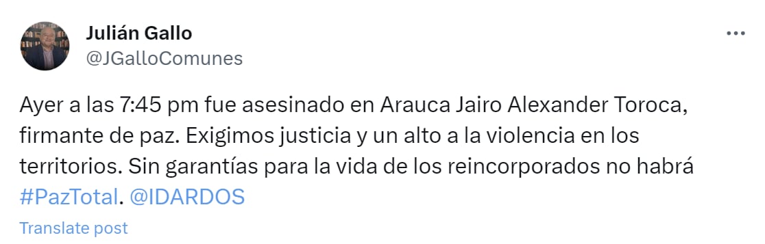 “Exigimos justicia y un alto a la violencia en los territorios. Sin garantías para la vida de los reincorporados no habrá #PazTotal”, dijo el senador de la República por el partido Comunes, Julián Gallo, en su cuenta de X.