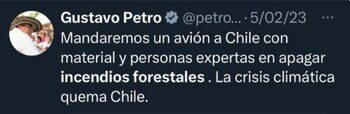 Por tal motivo, Cabal recordó un mensaje que el presidente Petro publicó el 5 de febrero de 2023, en el que señaló que desde el Gobierno nacional mandarían “un avión a Chile con material y personas expertas en apagar incendios forestales”. En aquella ocasión, el máximo líder del Pacto Histórico reconoció que la crisis climática “quemaba” el país sudamericano.