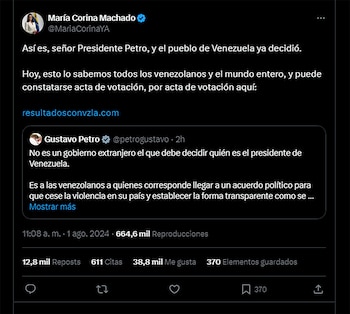 Sin embargo, en la mañana del primero de agosto, el presidente Gustavo Petro respondió a Machado que “no es un gobierno extranjero el que debe decidir quién es el presidente de Venezuela. Es a los venezolanos a quienes corresponde llegar a un acuerdo político para que cese la violencia en su país y establecer la forma transparente como se pueda adelantar un escrutinio con garantías para todos”, expresó Petro en sus redes sociales.