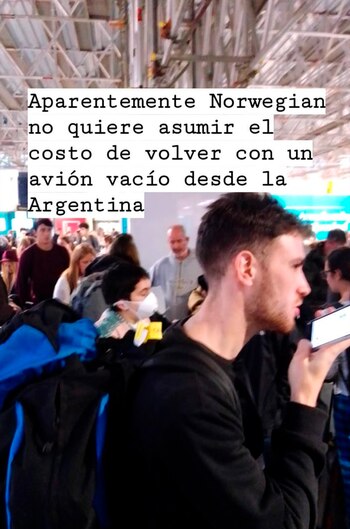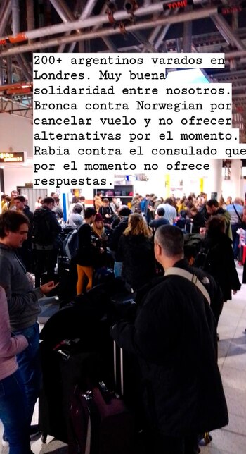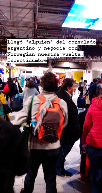 Llego al check-in de Norwegian y ya hay más de 200 argentinos apiñados frente al mostrador. Están totalmente desconcertados con la cancelación del vuelo de Norwegian a menos de 5 horas del horario de despegue. Me sumo a ellos. La solidaridad entre los pasajeros, ya oficialmente todos varados, es muy buena. Se arman grupos de whatsapp para intercambiar información. Todos intentan comunicarse con el Consulado para alguna asistencia, pero no hay respuestas que sirvan. Se negocia desordenadamente con la compañía, pero sin éxito.