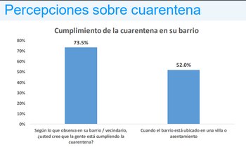 Sobre la percepción del acatamiento, el 73,5 por ciento cree que la gente cumple la cuarentena en sus barrios, pero sólo lo hace el 52 por ciento en villas y asentamientos.