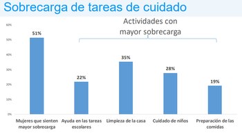 En cuanto a lo que sucede con las mujeres durante la cuarentena, el 51 por ciento de las mismas se siente “más sobrecargada con las tareas del hogar desde que se dictaron las medidas de aislamiento”. El 35 por ciento debido a tareas de limpieza, el 28 por ciento por el cuidado de niños y niñas, y el 22 por ciento por tareas escolares.