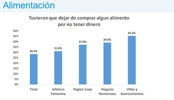 En cuanto a la alimentación y los consumos esenciales, un 28,3% de los hogares tuvieron que dejar de comprar algún alimento por no tener dinero. Este número asciende al 31 por ciento en el caso de hogares con jefatura femenina y al 45,3 en hogares en villas y asentamientos.