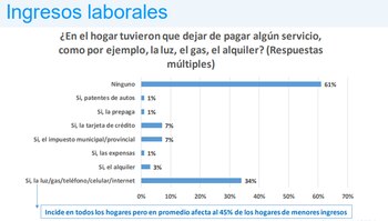 El porcentaje aumenta al 62 por ciento en la provincia de Buenos Aires, el 70 por ciento de quienes perciben la Asignación Universal por Hijo y el 75 en hogares numerosos. En el 7,2 por ciento de los hogares, alguien perdió al menos un empleo, cifra que crece al 10 por ciento en el NEA.