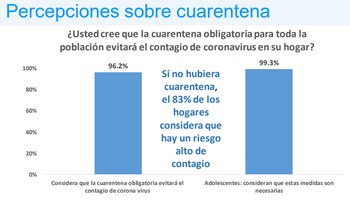 Según el documento, el 96,2 por ciento de la población asegura que la cuarentena obligatoria evitará el contagio de coronavirus en los hogares. Y el 99,3 por ciento de los adolescentes encuestados dice que es necesaria.