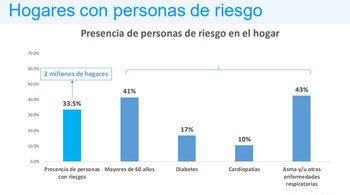 En dos millones de hogares (el 33,5 por ciento) viven personas en situación de mayor riesgo. Un 41 por ciento son mayores de 60 años, el 17 por ciento tienen diabetes, el 10 por ciento cardiopatías y el 43 por ciento asma u otras enfermedades respiratorias.