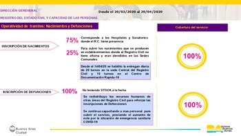 Respecto de las defunciones, el Registro Civil precisó que desde el inicio de la cuarentena hasta el 29 de abril pasado, hubo 5.079 inscriptas. Para ello, “se redistribuyeron los recursos humanos de otras áreas para reforzar esos trámites” y “se siguió capacitando más personal para cubrir el servicio, previendo el aumento (de muertos) por la emergencia sanitaria COVID-19”, agregaron.