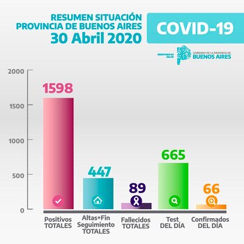 Lo que sí brindan, a diario, es una infografía con un resumen de la situación epidemiológica de la provincia de Buenos Aires con información de positivos totales, fallecidos, altas, cantidad de test realizados en el día y nuevos casos confirmados.