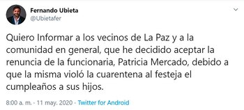 "Lamento mucho tener que tomar esta decisión, primero y principal porque se la calidad de persona que es Patricia y del trabajo importantísimo que estaba llevando adelante. Desde hace dos meses aproximadamente, hemos puesto todos los esfuerzos y recursos, económicos y humanos, al servicio de prevenir y cuidar a los ciudadanos del Departamento de esta pandemia que azota al mundo, la mejor decisión en este contexto es la que hemos tomado", afirmó Fernando Ubieta, jefe comunal kirchnerista.