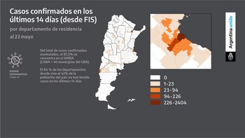 Para demostrar el “gran problema” en la ciudad de Buenos Aires y el Conurbano, se puntualizó que del total de casos confirmados el 87% se concentra en esa zona. Por el contrario, se informó que el 84% de los departamentos donde vive el 42% de la población no han tenido casos en las últimas dos semanas.