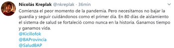 “Comienza el peor momento de la pandemia. Pero necesitamos no bajar la guardia y seguir cuidándonos como el primer día. En 80 días de aislamiento el sistema de salud se fortaleció como nunca en la historia. Ganamos tiempo y ganamos vida”, tuiteó esta mañana.