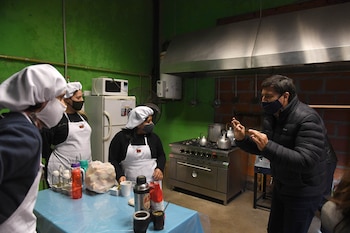 Infobae lo acompaña en la visita a Kbrones y lo ve varias veces distanciarse de los anfitriones, tanto en el taller como en el galpón donde le presentan a las cocineras del comedor y señalan una freidora donde “se hacen las mejores papa fritas del mundo”. Él se mantiene a distancia y así se lo piden sus colaboradores a todos los presentes.