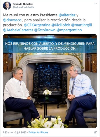 El ex presidente Eduardo Duhalde este jueves informó en las redes sociales que mantuvo un encuentro con su amigo Alberto Fernández en la quinta presidencial de Olivos y dio un dato más. Avisó que fue con el actual titular del BICE, el ex titular de la Unión Industrial Argentina (UIA) José Ignacio de Mendiguren, que fue ministro de Producción de Duhalde cuando él mismo estuvo al frente del Ejecutivo.