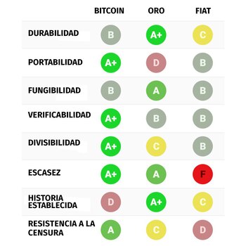 En la siguiente tabla se comparan Bitcoin, Oro y Moneda Fiat (como el dólar) según los atributos mencionados anteriormente. A continuación explicaremos la razón de cada puntuación: