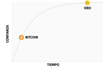 Ningún bien monetario tiene una historia tan larga y conocida como la del oro, que ha sido atesorado desde que la civilización humana existe. Hoy en día las monedas antiguas aún mantienen un valor significativo. En el extremo contrario tenemos el dinero fiat, que es una reciente anomalía histórica. Desde su invención, las monedas fiat han tendido a perder todo su valor con el tiempo, prácticamente en todos los casos. El uso de la inflación como una forma "invisible" de cobrar impuestos a los ciudadanos es tan políticamente rentable que pocas naciones en la historia han podido resistir. Si el siglo 20, en el cual el dinero fiat afirmó su dominio sobre el orden monetario global, ha establecido alguna verdad económica es que no podemos confiar que las monedas fiat mantendrán su valor a largo plazo, ni tan siquiera a medio. A pesar de su corta existencia, Bitcoin ha superado tantas pruebas en los mercados que existe una alta posibilidad de que su valor como activo no desaparezca a corto plazo. Es más, el efecto Lindy sugiere que cuanto más tiempo sobrevive, mayor será la confianza de la sociedad en que seguirá existiendo en el futuro. En otras palabras, la confianza de la sociedad en los bienes monetarios tiene una naturaleza asintótica, como ilustra el siguiente gráfico: