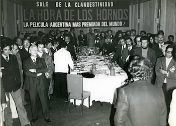 — Bueno, esa idea del "cine acto" nació mucho antes de hacer la película. Nosotros proyectábamos películas que estaban prohibidas, cortometrajes cubanos, cortometrajes de la guerra de Vietnam, documentales brasileños sociales. Hacíamos esas proyecciones por los barrios y se llenaba de gente. Entonces pasábamos en 16mm. Pensá que cada 45 minutos, 50 minutos, había que cambiar el rollo. Cuando había que cambiar el rollo prendías la luz y pasaban dos o tres minutos, se armaba espontáneamente una conversación y una discusión en la sala, no de las películas, a partir de las películas la gente enseguida hacía el puente con lo que estaba pasando. Y ahí salió la idea de dividir la película en partes. La primera parte de esta película es una película de provocación la primera parte, concebida para proyectarse a todos los públicos y sacudirlos, es un clásico del cine denuncia. Pero la segunda y tercera parte son lo contrario, es un discurso, un lenguaje absolutamente calmo que busca la reflexión. Y provoca al espectador a que participe. Es más, cada 45, 50 minutos hay un cartel que dice: "Espacio abierto al compañero relator", y siempre había alguno de nosotros que dábamos la película que abríamos el debate.