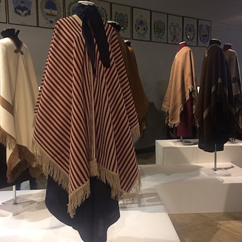 La instalación de ponchos se exhibe sobre maniquíes acicalados por las túnicas en tonos de negro, crudo, yerba mate y bordó creadas a medida por la diseñadora Vicki Otero, una experta en recrear los modismos de trajes regionales para las pasarelas contemporáneas. Sobre las toiles negras irrumpe un poncho con rayas verticales en rojo granate y marrón con terminación de flecos a peine urdido por Vilma Guzmán, una artesana salteña de 31 años, quien despuntó el oficio en la adolescencia y con los telares de su padre, el eximio tejedor Alfonso Guzmán. El ribete y el moño de su creación se coronan con un lazo negro ideado por Otero inspirándose en los pañuelos golilla o serenero que ciñeron cuellos y frentes de los gauchos.