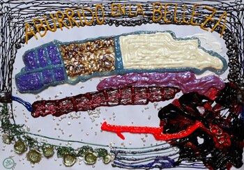 – Mi material más preciado es la pintura relieve, unos frasquitos de plástico de 35 milímetros de fabricación brasileña. Es un tipo de pintura gomosa que permite realizar distintas formas que se elevan de la superficie y que cuando se seca permanece intacta en el tiempo. Yo la uso desde un mural que hice en la Fundación Proa en 2005. Además, son un pegamento de alta calidad que me permite incrustar formas y pedazos de plástico, madera, metal y otros materiales. Para mí es fundamental escribir con esta pintura porque hago letras altísimas y muy claras de distintos grosores y colores mezclados entre cada capa que agrego (detesto los textos hechos con pincel). También utilizo acrílico, gel medium, tinta, lápiz y marcadores.
