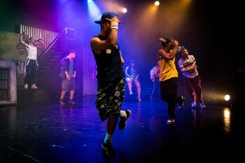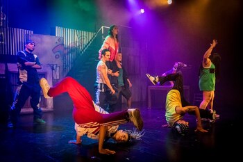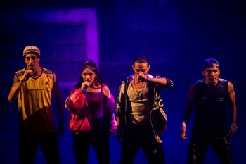Nadie encarna a Mateo: seis varones y dos mujeres, las ocho voces de El arrebato, cuentan su vida en un barrio de una ciudad que, dicen esas voces, “está rota”. Ropa urbana -camisetas de basquet, zapatillas de las grandotas, camperas de talles amplios, una paleta de colores que podría venir en aerosol para hacer graffitis- y micrófono en mano, los ocho actores son un coro que describen la vida de ese personaje al que todos ven pero nadie le conoce la cara. El arrebato acaba de estrenarse en el teatro El método Kairos, en Palermo, es una coproducción de esa sala junto con el FIBA y el programa Arte en Barrios y podrá verse ahí hasta que termine abril, los lunes.