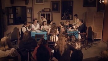 Sinopsis: Un almuerzo argentino, una mesa larga, fideos con salsa y copas de vino. Un brindis. Un compromiso. Dos familias y una deuda. Una llegada inesperada. Octubre de 1952. La grieta, la de antes y la de ahora. Los peronistas y anti peronistas. Los adoradores de Evita y sus detractores. Ayer es hoy sin piedad.