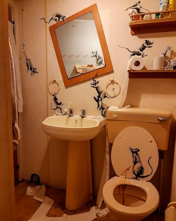 En el marco del confinamiento obligatorio debido al coronavirus, el artista urbano Bansky exhibió hoy una nueva creación en el interior de su casa -concretamente en su baño- a través de una serie de instantáneas publicadas donde se puede observar a distintas ratas en la pared o en el espejo, jugando con la pasta dentífrica o el papel higiénico e, incluso, una de ellas orinando en posición vertical sobre el inodoro.