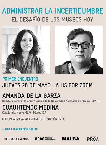 La directora de Fundación Proa, Adriana Rosenberg, dialogará con Cuauhtémoc Medina, curador en jefe del MUAC Museo Universitario Arte Contemporáneo y Amanda de la Garza, Directora General de Artes Visuales de la Universidad Autónoma de México (UNAM), sobre las formas de Administrar la Incertidumbre en el contexto de la pandemia, el estado de los museos en México y perspectivas de futuro.