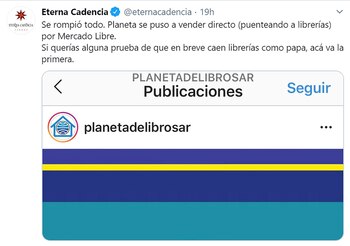 Desde las redes sociales, la indignación por estas medidas no se hizo esperar. La cuenta de Eterna Cadencia, por ejemplo, tuiteó: “Se rompió todo. Planeta se puso a vender directo (puenteando a librerías) por Mercado Libre. Si querías alguna prueba de que en breve caen librerías como papa, acá va la primera”.
