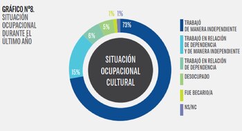 Con relación a la situación ocupacional en el ámbito cultural durante el último año, el 73% de las personas encuestadas afirmó trabajar únicamente de manera independiente, un 6% solo en relación de dependencia, y un 5% estuvo desocupado (no pudo trabajar de su actividad cultural a pesar de haber buscado). El porcentaje de mujeres desocupadas (en su actividad cultural) el último año representa un 5%, disminuyendo un punto en el caso de los varones que respondieron la encuesta. Entre quienes trabajan solo de manera independiente, nueve de cada diez personas declararon no tener ingresos estables.