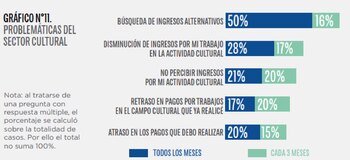 Entre las situaciones problemáticas atravesadas el último mes, el 38% lo tiene la cancelación de actividades, el 33% es “no percibir ingresos por mi actividad cultural”, el 31% “disminución de ingresos por mi trabajo en la actividad cultural”, el 30% “atraso en los pagos que debo realizar” y 29% “imposibilidad de pago de alquiler o servicios de mi vivienda”. En cuanto a las estrategias de supervivencia, el 22% empezó a realizar trabajos desde el hogar y reuniones virtuales, otro 22% comenzó a dar clases y talleres, y el 15% espera que la cuarentena termine mientras vive de sus ahorros.
