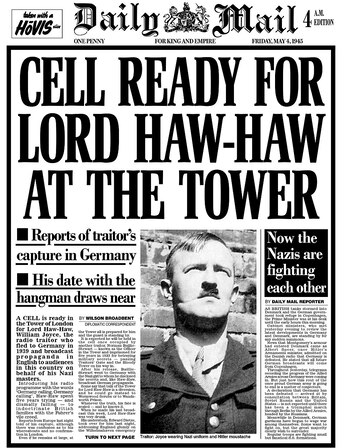 A medida que los aliados avanzaban en territorio alemán, la actividad mediática de Joyce aumentó, aunque a veces transmitía notablemente alcoholizado. Finalmente fue capturado y herido camino a Dinamarca. Trasladado a Inglaterra fue juzgado por traición al rey. Al escuchar los cargos se declaró “no culpable”. Durante el juicio salió a la luz su nacionalidad americana, pero el hecho de tener un pasaporte británico lo obligaba (según los fiscales) a ser leal al rey, como afirmó Sir William Shawcross, quien sería uno de los encargados del juicio de Núremberg para castigar las atrocidades de los nazis.