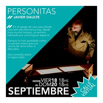 Este viernes 18, sábado 19 y domingo 20 estará disponible la obra “Personitas” con dramaturgia y dirección de Javier Daulte, y la actuación de Héctor Díaz, Andrea Garrote, Dario Grandinetti, Laura Grandinetti, Marío Onetto.