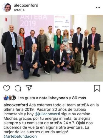 Infobae Cultura dialogó con fuentes cercanas de arteBA, quienes confirmaron la salida de Converti como una manera de plantar a la feria de cara al futuro. Alec Oxenford, quien fuera presidente de la feria y máximo aval de Converti en el espacio, así lo confirmó aún antes de que desde la organización se lanzara el comunicado oficial. Oxenford escribió: “Pasaron 20 años de trabajo incansable y hoy Julia Converti sigue su camino. Muchas gracias por tu energía, tu alegría siempre y camiste arteBA 24x7. Ojalá nos crucemos de vuelta en alguna nueva aventura”.