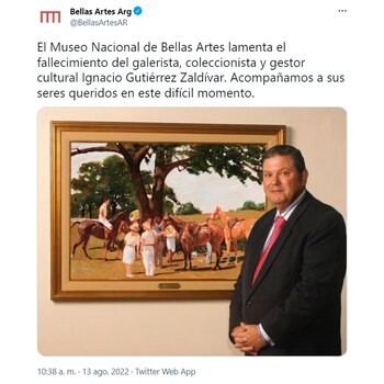 Ignacio Gutiérrez Zaldívar, fundador de la porteña galería Zurbarán y curador de las obras de arte ubicadas en el despacho presidencial de la Casa Rosada entre 1992 y 2010, murió a los 70 años, informaron sus allegados en las redes sociales. Escribano, escritor, coleccionista y mercader de arte, fue curador de más de mil exposiciones de arte, autor de 113 libros dedicados al arte argentino y condecorado por el Gobierno de Francia con la Orden de las Artes y las Letras en el grado de Caballero en 1992.