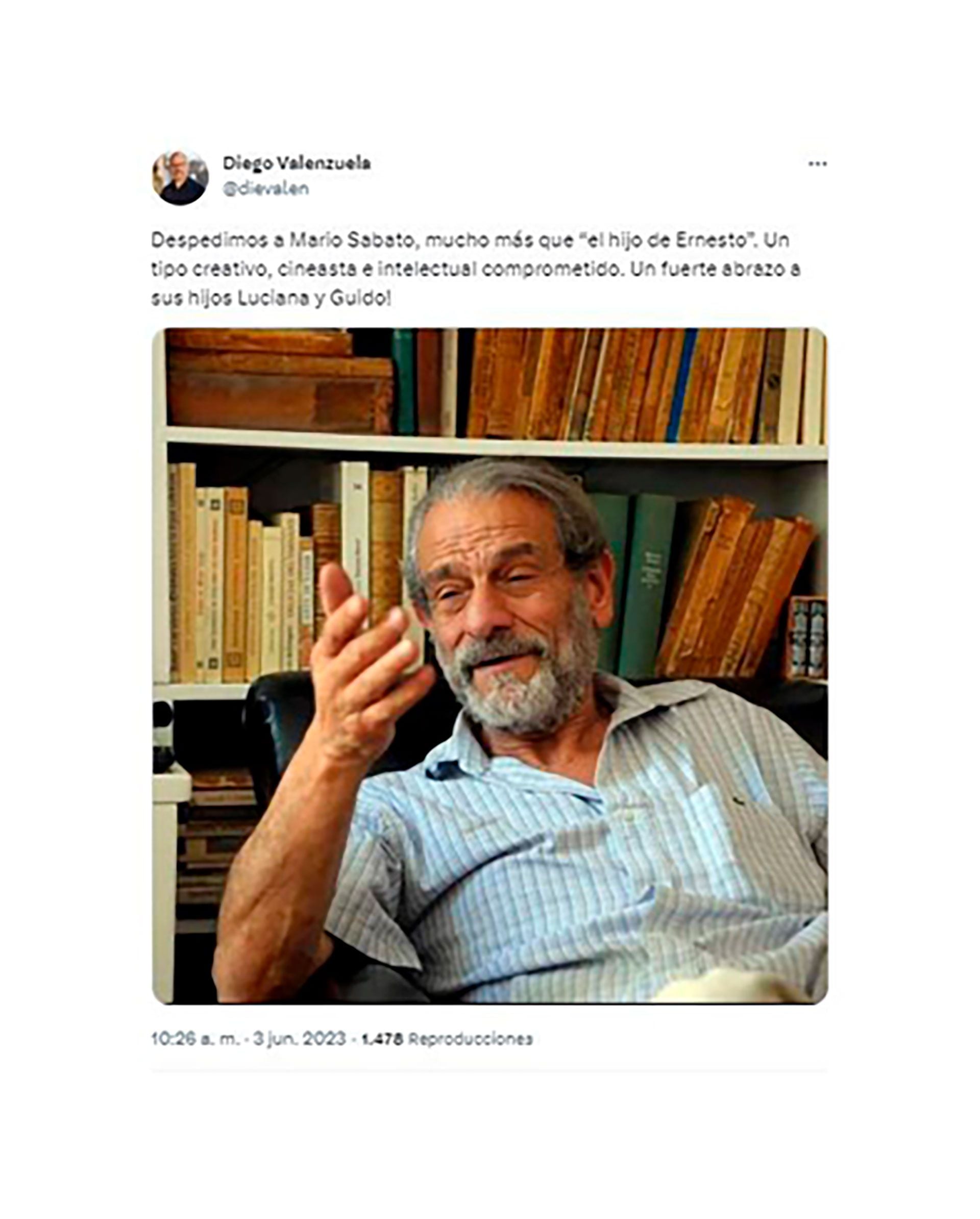La noticia de la muerte no tardó en replicarse en redes sociales y uno de los primeros en manifestarse fue Diego Valenzuela, historiador e intendente de Tres de Febrero, donde la familia Sabato vivió. “Despedimos a Mario Sabato, mucho más que “el hijo de Ernesto”. Un tipo creativo, cineasta e intelectual comprometido”, escribió en su cuenta de twitter.