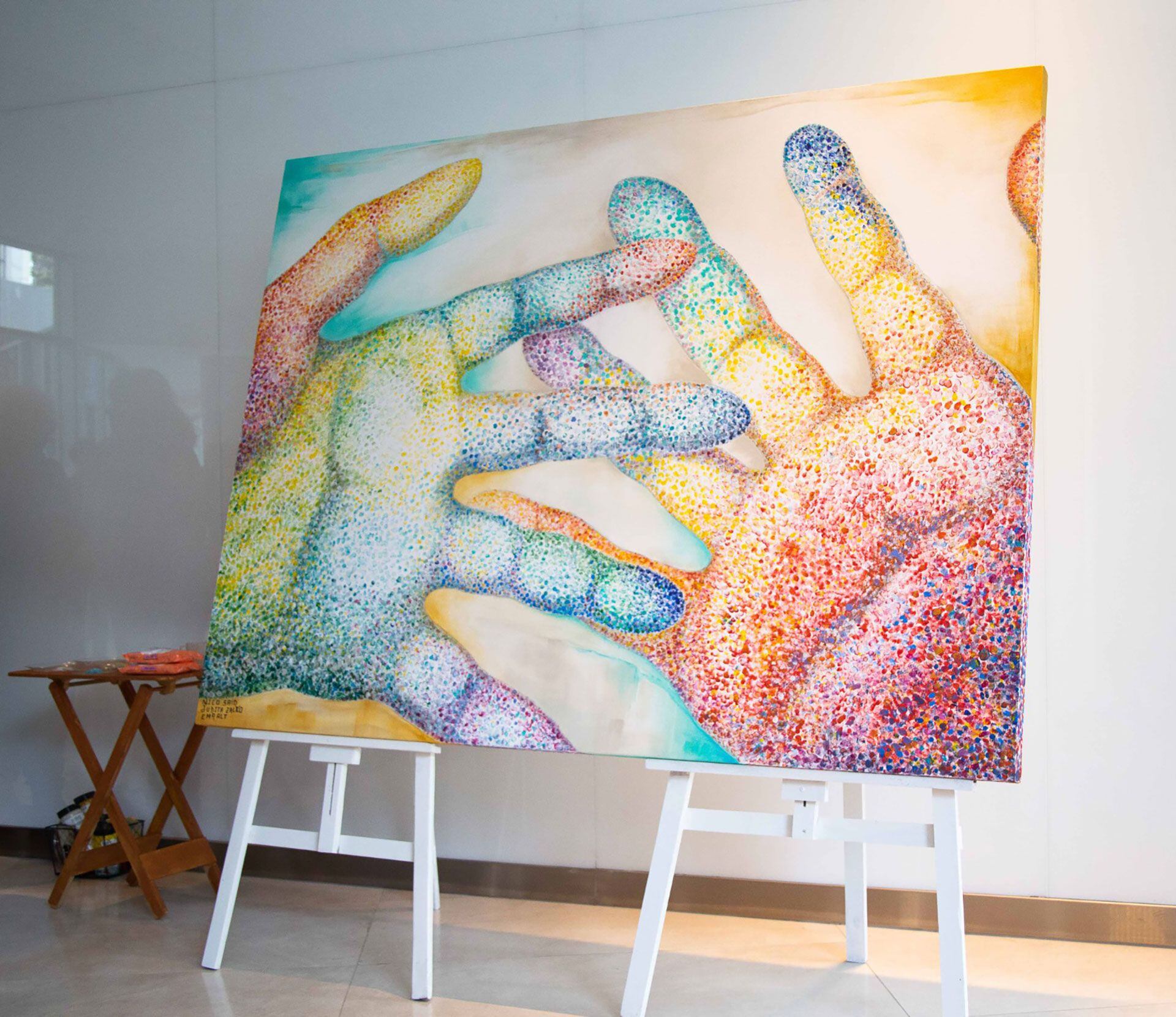 Lo sabe el equipo de médicos que me asiste cada cierto tiempo y que debe pasar todos los días frente a ese cuadro de una mano que da y una que recibe, coloreada por centenares de huellas dactilares de todo tipo, entre las que se encuentra una, la mía, en azul. Es una huella perdida más, pero que en conjunto es una constatación de vida. Algo que siempre, según dicen, es muy bueno.