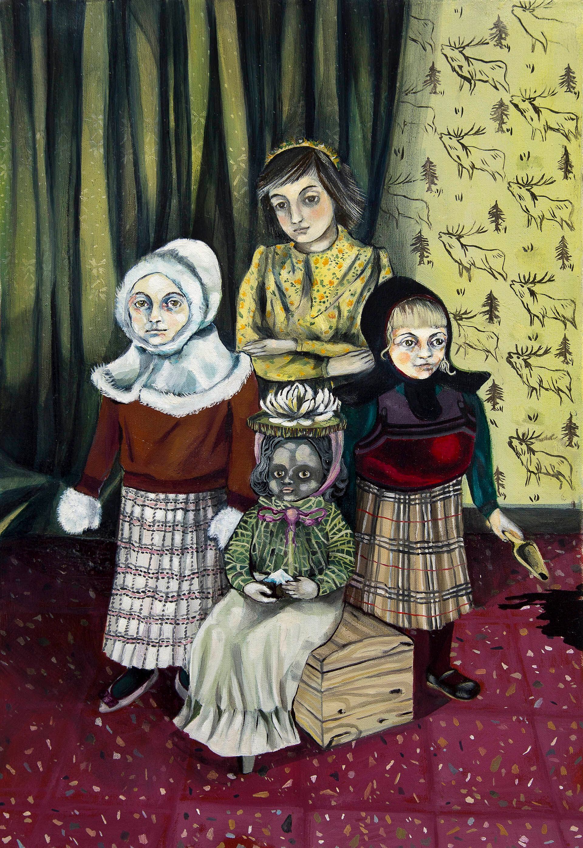Como en el Renacimiento, varios de estos retratos están compuestos por la figura y una mascota animal, proponiendo un juego de significados especial en cada obra. Un topo nariz estrella, un tardígrado, una mulita, un escorpión e incluso una bestia que parece salida de los jardines de El Bosco, como en Hidden mother, también hay referencias al mundo vegetal relacionadas a lo acuático como en La cuarta hermana, donde una niña de piel más oscura a las otras sostiene sobre su cabeza un lirio de agua, mientras otra, con una palita, arroja tierra hacia un costado o en Niña escorpio y el bosque de pitras, donde los troncos de estos árboles que crecen en zonas pantanosas aparecen representado en pequeños cuadros en el fondo.